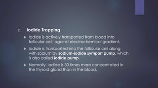 Thyroid hormone-producing cells are the only cells in your body that absorb iodine. Iodide reaches the cytosol of thyroid follicular cells via an active transport mechanism mediated by sodium-channel iodine - NaI - symporter NIS. Derivation of Thyroid Follicular Cells From Pluripotent Stem Cells.